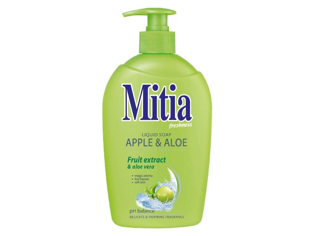 Tekuté mydlá s dávkovačom, obsahujúce kolagén. Mitia tekuté mydlo Apple & Aloe, to je tá najlepšia starostlivosť o Vašu pokožku. Jemné zloženie spoločne s ovocným extraktom a výťažkami Aloe Vera s upokojujúcimi a regeneračnými účinkami ju pomáha zachovať hebkú a vláčnu. Objem 500 ml. Dopĺňateľné náhradnou náplňou obj.kód HY772094.