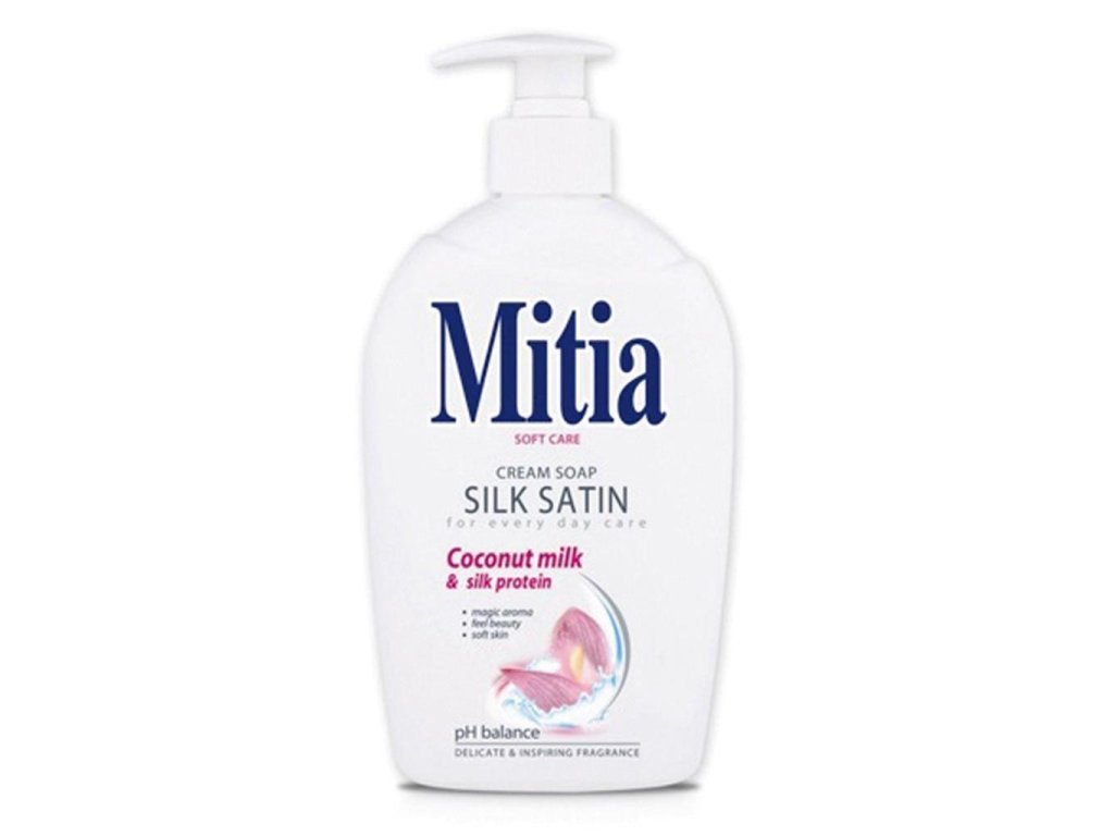 Tekuté mydlá s dávkovačom, obsahujúce kolagén. Objem 500 mℓ. Dopĺňateľné náhradnými náplňami. Náplne do tekutých mydiel Mitia s objemom 500 mℓ.