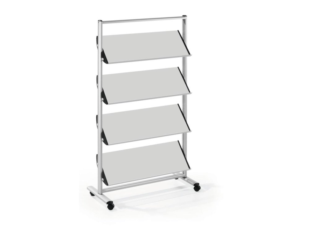Vysoko kvalitný elegantný a pevný mobilný prezentačný stojan na časopisy alebo katalógy formátu A4. Stojan je dodávaný v rozloženom tvare. Materiál kov. Farba svetlosivá/-čierna. Štyri police s možnosťou fixácie v 3 sklonoch na max. 12×A4 formátov.