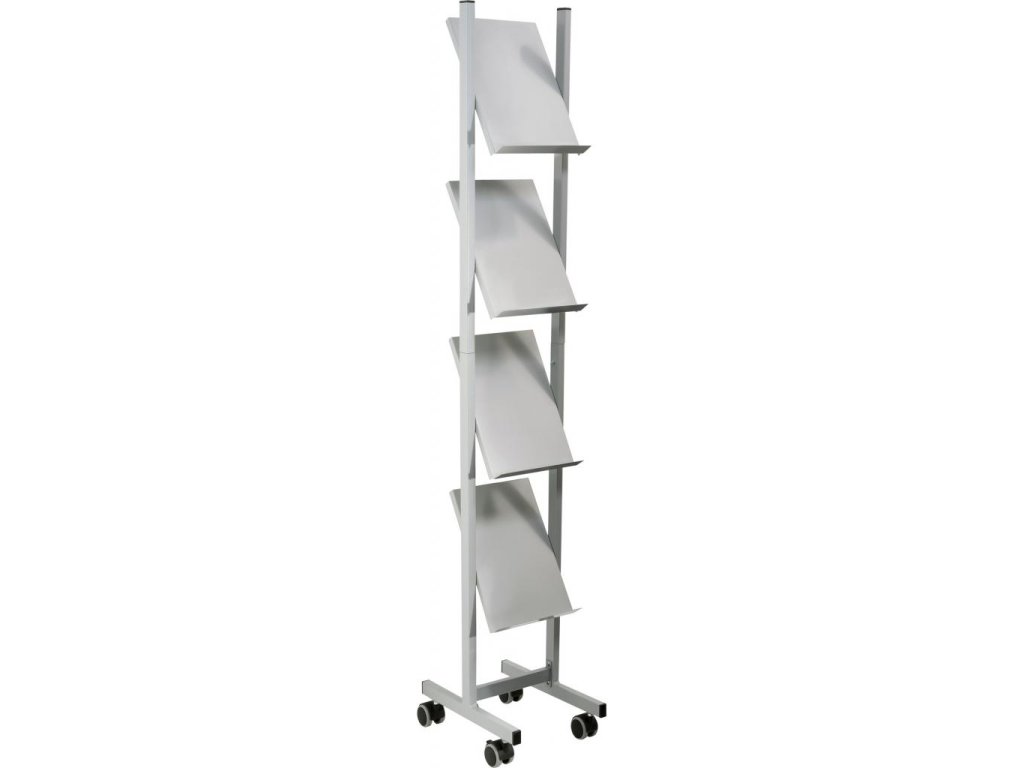 Vysoko kvalitný elegantný a pevný mobilný prezentačný stojan na časopisy alebo katalógy formátu A4. Stojan je dodávaný v rozloženom tvare. Materiál kov. Farba svetlosivá. Štyri police na 4 × A4 formáty. Rozmery (š × v × h) 260 × 1 580 × 390 mm.