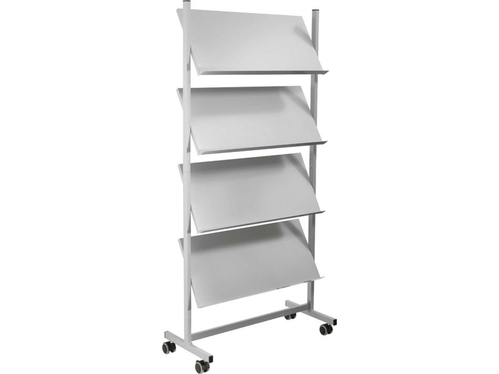 Vysoko kvalitný elegantný a pevný mobilný prezentačný stojan na časopisy alebo katalógy formátu A4. Dodávaný v rozloženom tvare. Materiál kov. Farba svetlosivá/ čierna. Štyri police s možnosťou fixácie v 3 sklonoch na max. 12 × A4 formátov. Rozmery (š × v × h) 750 × 1 570 × 360 mm.