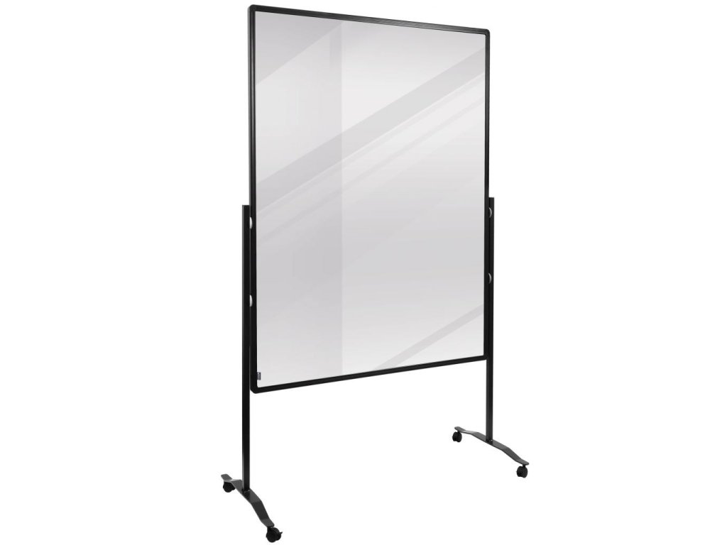 Predeľovacia tabuľa s priehľadným povrchom z plexiskla hrúbky 4 mm, popisovateľná popisovačmi na biele tabule. Nohy so štyrmi uzamykateľnými kolieskami. Hliníkový rám, nohy a pätky s čiernymi plastovými koncovkami. Ľahko oddelí stoly a vytvorí tak bezpečné a hygienické pracovné prostredie. Rozmery 150 × 120 cm.