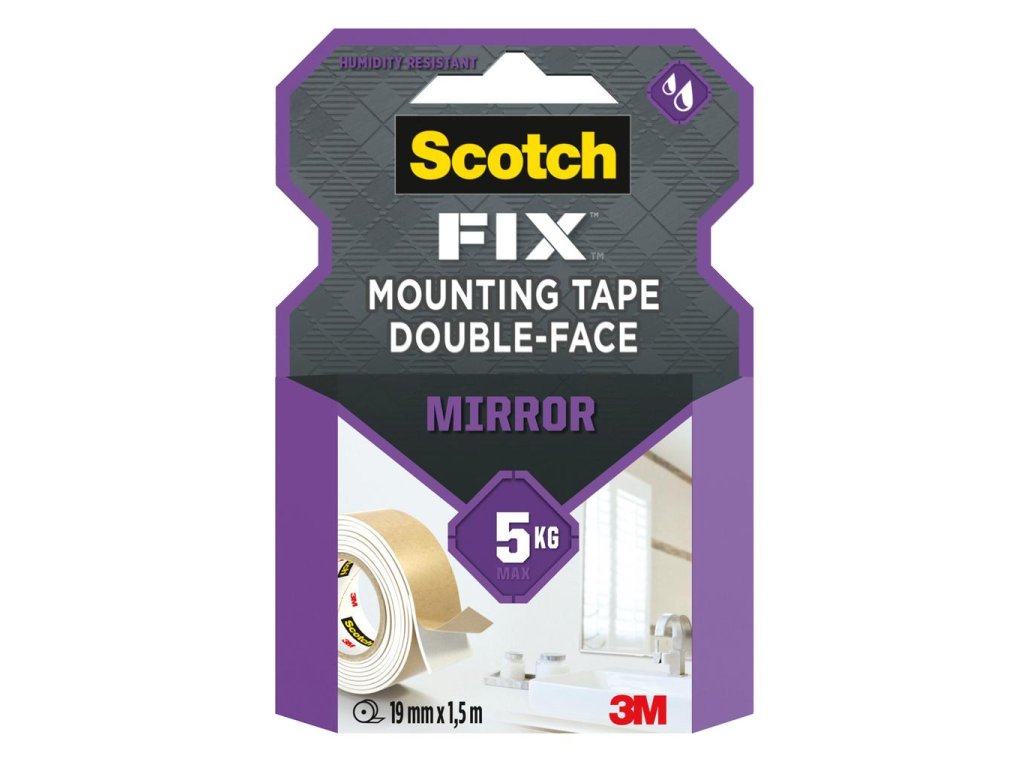 Obojstranná montážna páska Scotch-Fix™ vhodná na použitie v kúpeľni. Táto penová páska s nosnosťou do 5 kg je určená na použitie v interiéri a je vhodná aj do vlhkého prostredia. Preto je ideálna na lepenie zrkadiel, keramiky, dlaždíc, povrchovo upraveného dreva, kovov, skla a na maľované steny. Rozmery 19 mm × 1,5 m.