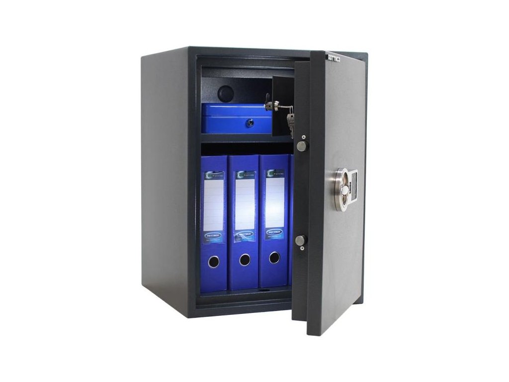 Vnútro trezora je pomerne variabilné a disponuje okrem posuvnou poličkou aj samostatne uzamykateľnou schránkou v hornej časti trezora.