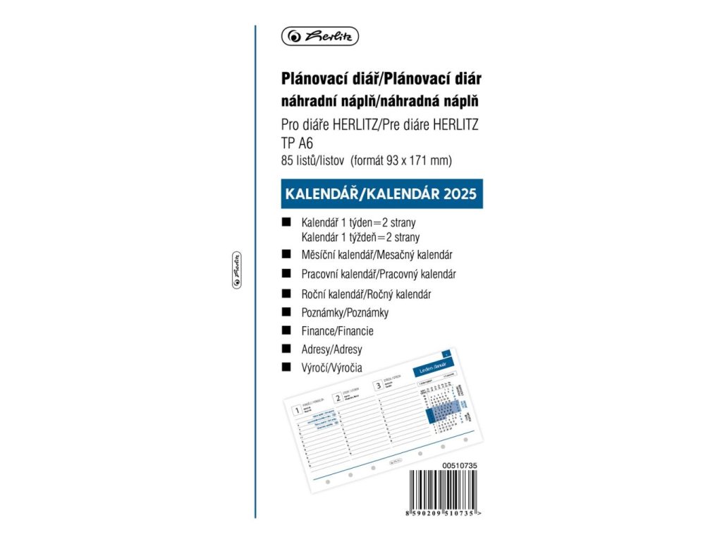 kalendár 1 týždeň = 2 strany, mesačný a ročný kalendár, česko slovenské kalendárium, poznámky, financie, adresy, výročie, rozmer 93 x 171 mm, 85 listov, šesťdierovanie