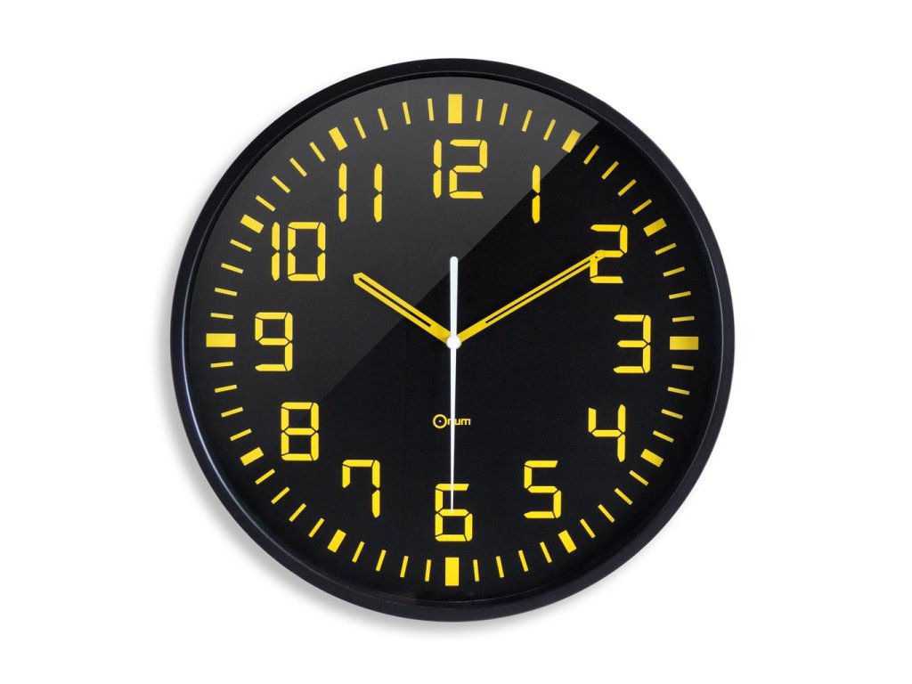 Quartz hodiny s analógovým zobrazením času a tichým chodom. Čierny ciferník kontrastuje s veľkými žltými arabskými číslicami a bielou sekundovou ručičkou. Materiál ABS plast, odolný voči nárazom, ochranné minerálne sklo, priemer 30 cm. Batéria AA je súčasťou balenia.