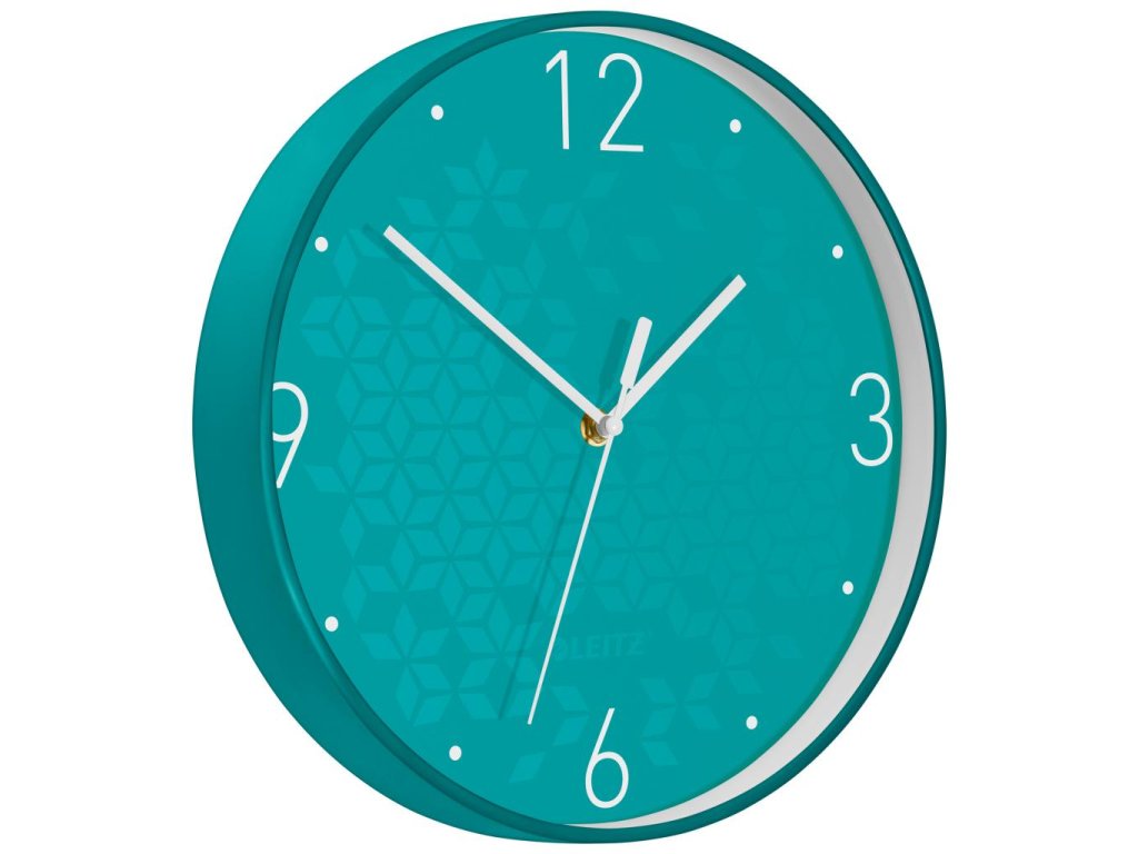 Quartz hodiny z produktového radu Leitz WOW. Tichý chod, dvojfarebný rám z pevného plastu v kombinácii so sklenenou prednou stranou. Jasný ciferník vo WOW farbách s veľkými číslicami, tri kontrastné ručičky viditeľné aj z diaľky. Priemer 29 cm, hrúbka 4,3 cm. Batéria AA nie je súčasťou balenia. Farba ľadovo modrá.