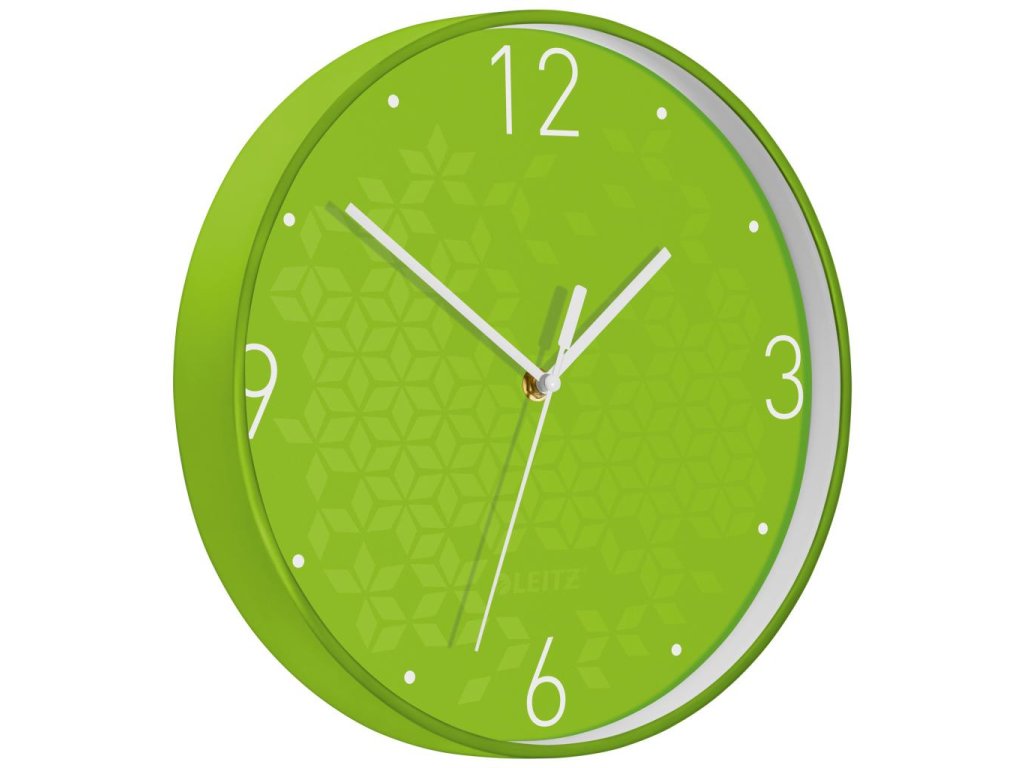 Quartz hodiny z produktového radu Leitz WOW. Tichý chod, dvojfarebný rám z pevného plastu v kombinácii so sklenenou prednou stranou. Jasný ciferník vo WOW farbách s veľkými číslicami, tri kontrastné ručičky viditeľné aj z diaľky. Priemer 29 cm, hrúbka 4,3 cm. Batéria AA nie je súčasťou balenia. Farba zelená.