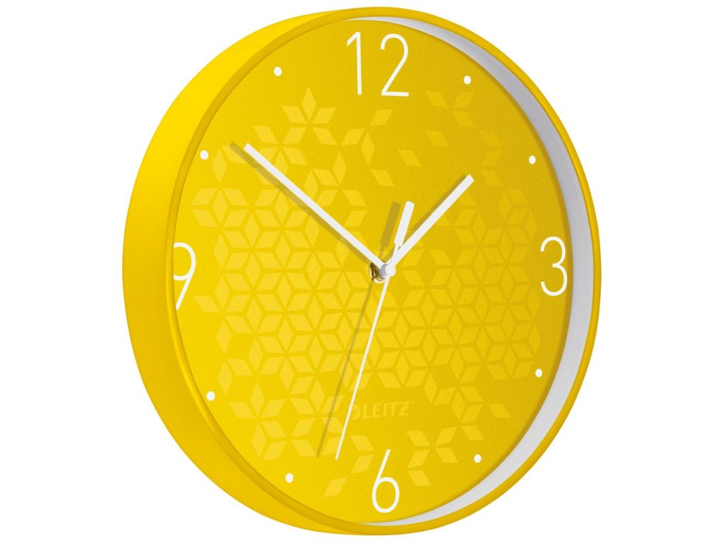 Quartz hodiny z produktového radu Leitz WOW. Tichý chod, dvojfarebný rám z pevného plastu v kombinácii so sklenenou prednou stranou. Jasný ciferník vo WOW farbách s veľkými číslicami, tri kontrastné ručičky viditeľné aj z diaľky. Priemer 29 cm, hrúbka 4,3 cm. Batéria AA nie je súčasťou balenia. Farba žltá.
