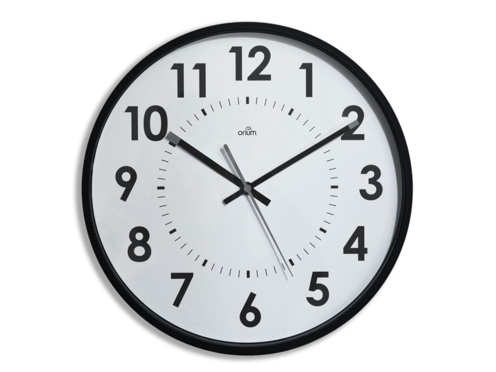 Quartz hodiny s analógovým zobrazením času a úplne tichým chodom. Veľký biely ciferník s veľkými čiernymi arabskými číslicami