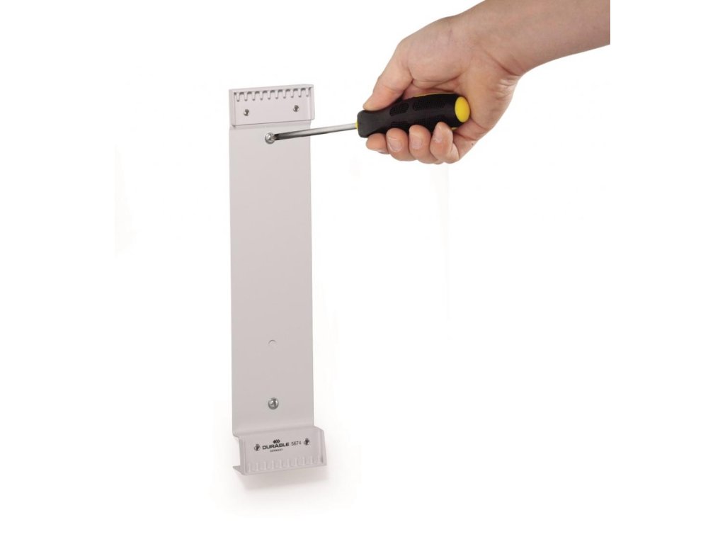 Nástenný kovový držiak katalógových panelov s kapacitou 10 panelov, vhodný pre dielne, predajné a výstavné miestnosti. Panelové držiaky možno radiť vedľa seba a tým znásobovať celkovú kapacitu panelov. Dodávaný bez panelov. Farba sivá.