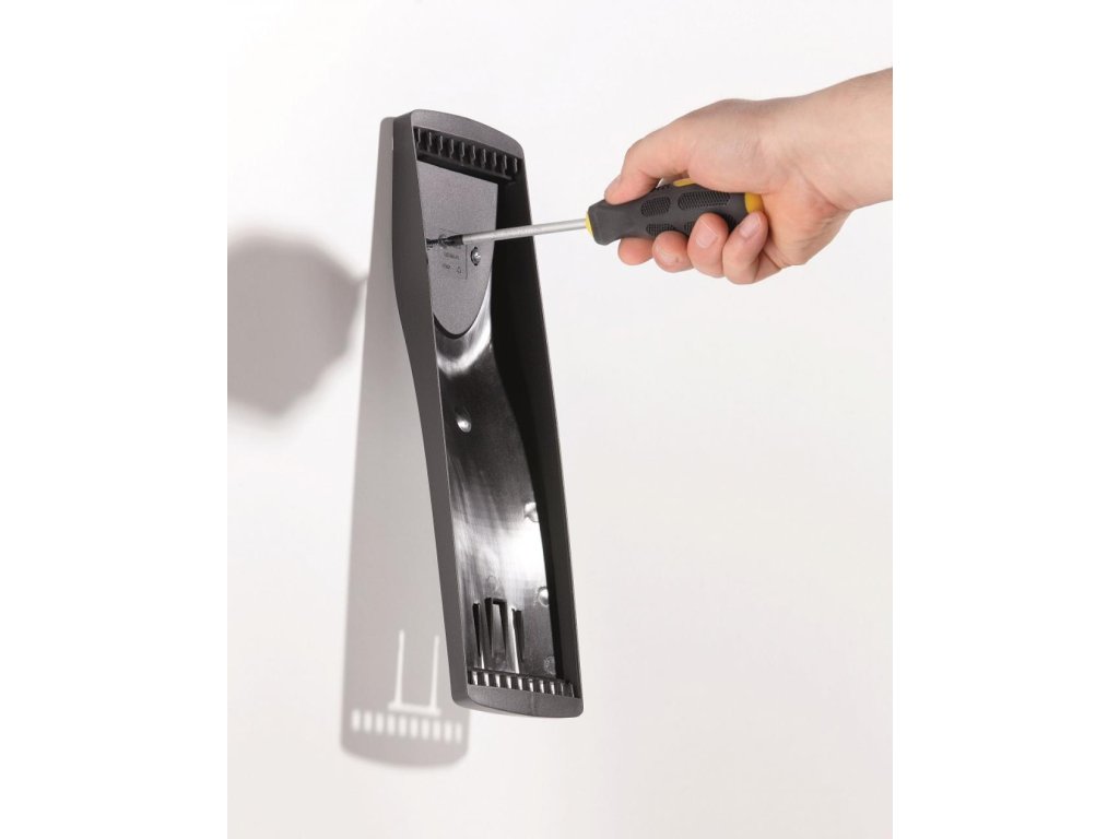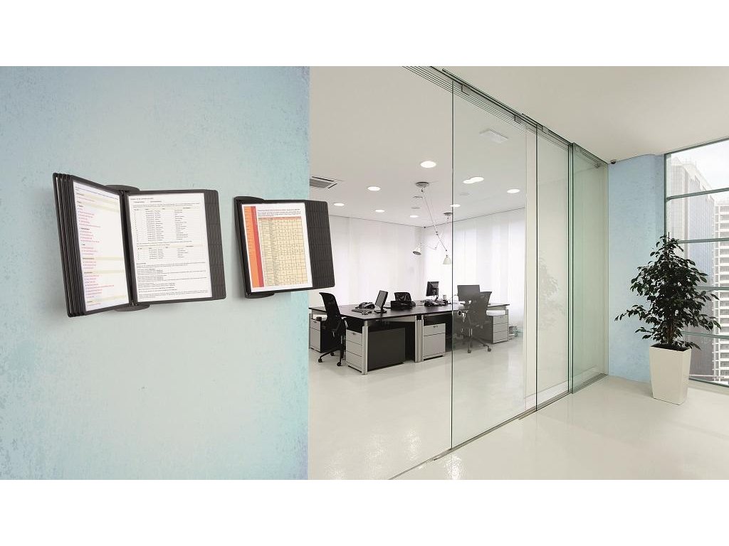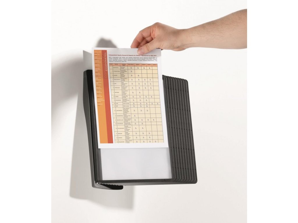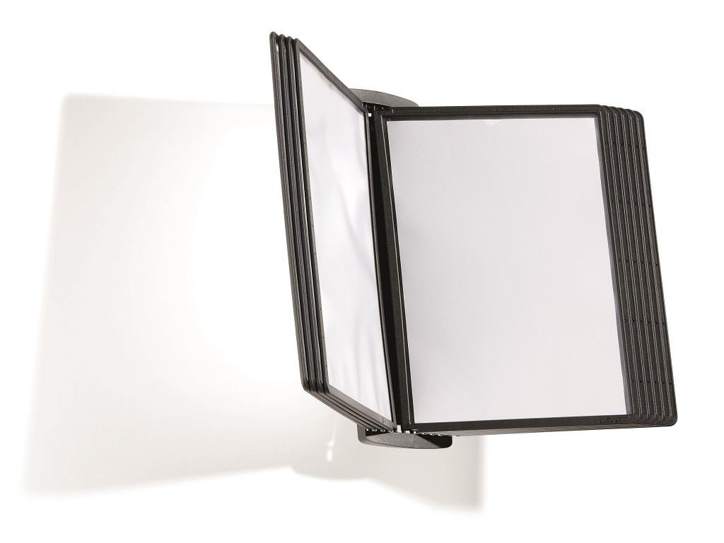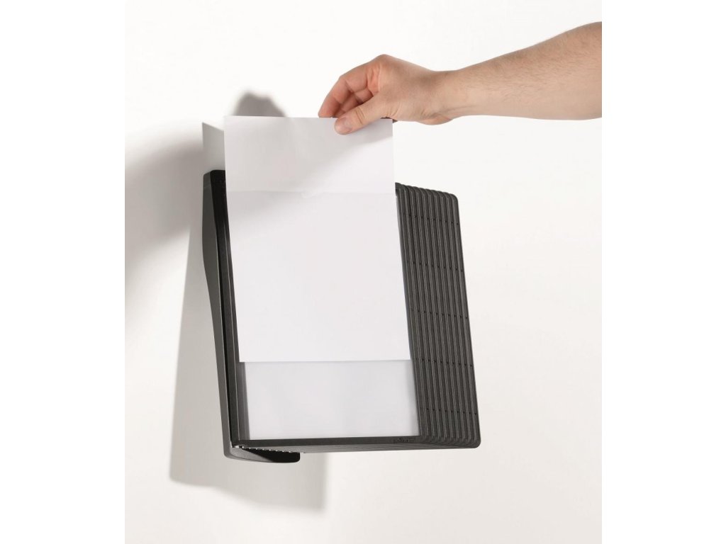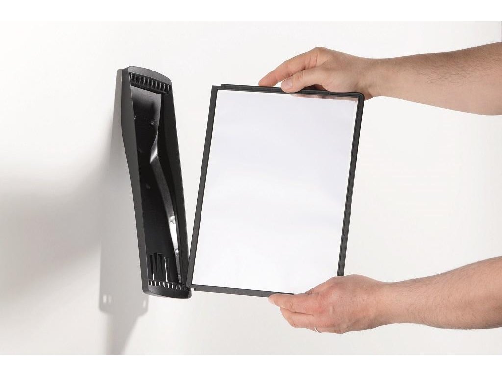 Štýlový nástenný stojan dodávaný s 10 displejovými panelmi a indexami. Ideálny do kancelárií a na verejne prístupné miesta. Otvor na hornej strane panelu zabezpečuje jednoduché vkladanie a v prípade potreby rýchlu výmenu vložených materiálov. Farba panelov čierna.