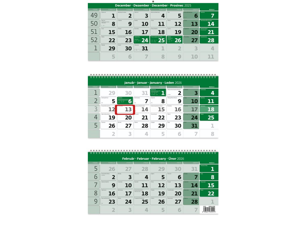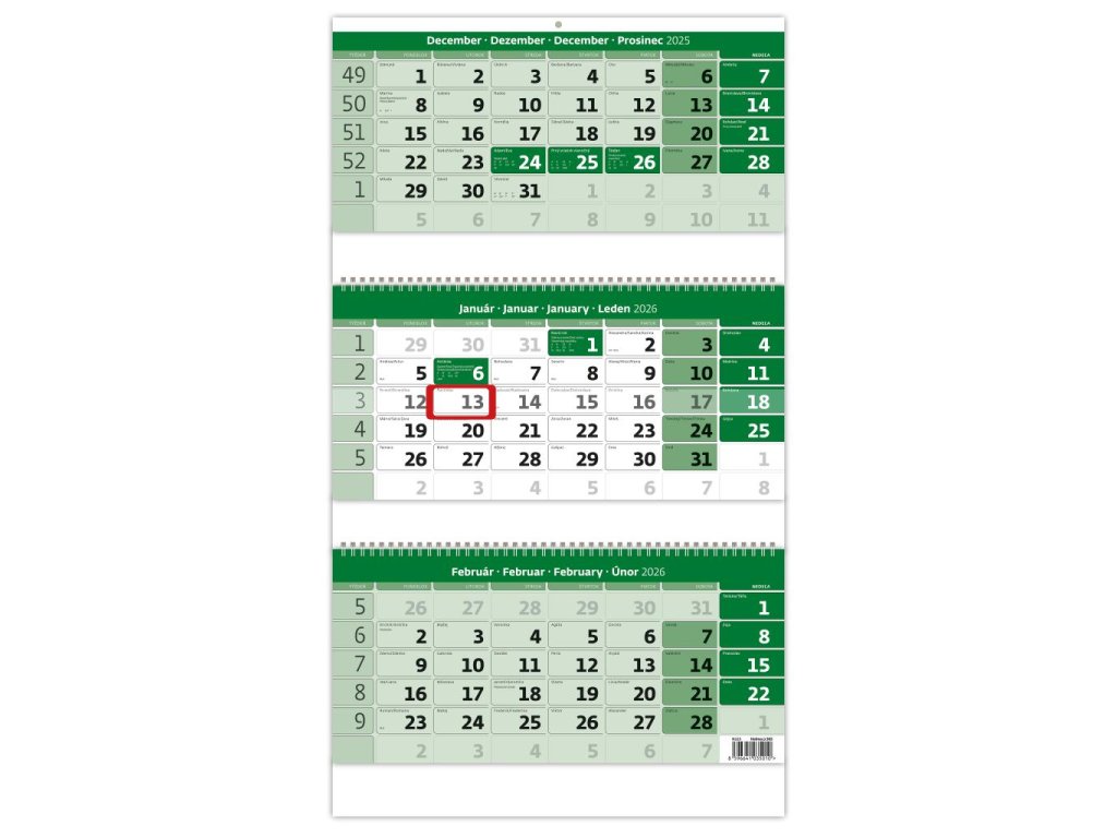 Nástenný kalendár 3-mesačný zelený so špirálou 31,5 x 55,5 cm 2026