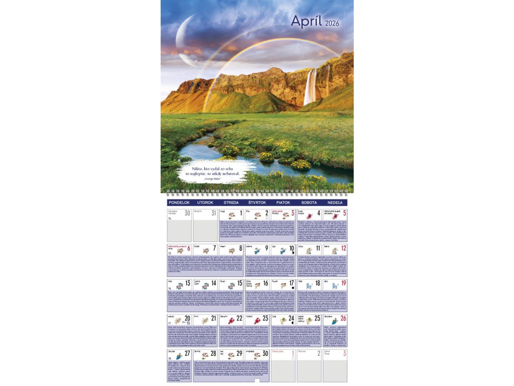 Tento kalendár ponúka praktické rady pre každý deň, ktoré sa riadia podľa fáz Mesiaca. Dozviete sa, kedy je vhodný čas na odpočinok, aktivitu, rozhodovanie či starostlivosť o telo a dušu. Každá fáza prináša odporúčania, čo robiť a čomu sa radšej vyhnúť. Silné fotografie a inšpiratívne citáty dodávajú kalendáru výnimočnú atmosféru.