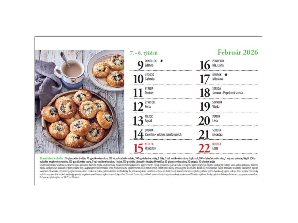 Nástenným dvojtýždňový kalendár s obrázkami a receptami jedál . Obsahuje slovenské kalendárium , fázy Mesiaca, doplnený o abecedný zoznam receptov, prehľadný kalendár na rok 2026 a 2027.
