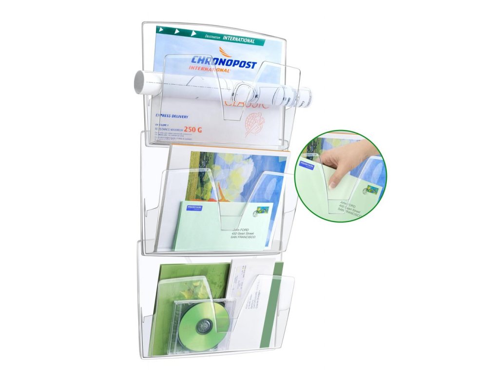 Panel s tromi odkladačmi na triedenie pošty pre dokumenty formátov do 24 × 32 cm s možnosťou zavesenia odkladačov spolu alebo každého separátne. Postranný „U“ rez udrží obálky A3+. Materiál nárazuvzdorný recyklovaný polystyrén. Rozmery jedného odkladača (š × v × h) 361 × 270 × 86 mm. Dodávané vrátane montážnych skrutiek. Farba číra.