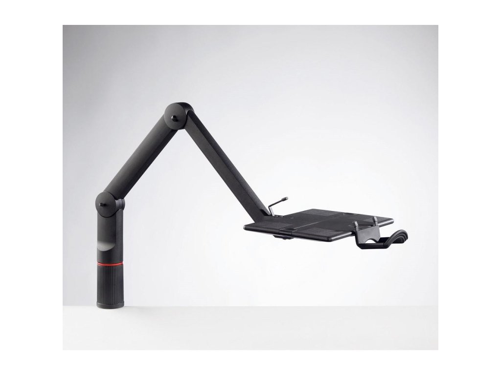 Kĺbový nosič telefónu. Otáčanie o 360 stupňov, 3 fixované pozície, nosnosť 2 kg. Sklon základne (10, 5 a 0 stupňov) upravuje výber pozície a umožňuje pohodlnú manipuláciu s nosičom. Výška nad pracovným stolom 14 cm. Základňa inštalovaná na šírku alebo na výšku, t. j. 26 × 17 cm alebo 17 × 26 cm. Dodávaný v štandardnej verzii s úchytom na hrúbku stola 1,8 až 7,4 cm. Farba antracitová.