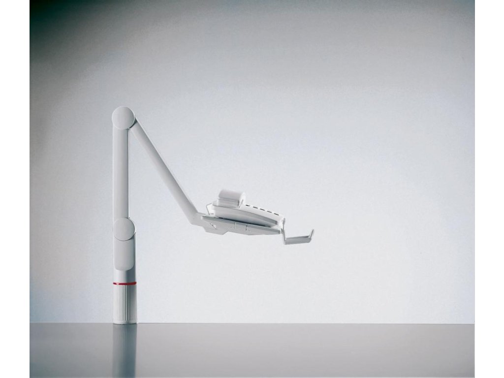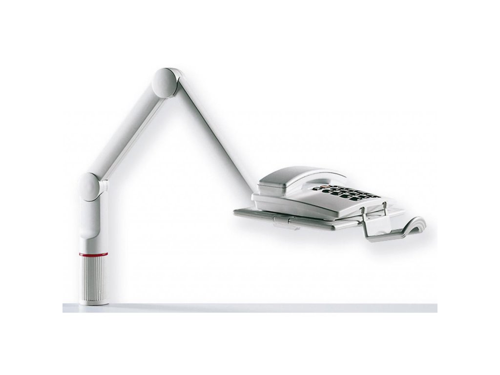 Kĺbový nosič telefónu. Otáčanie o 360 stupňov, 3 fixované pozície, nosnosť 2 kg. Sklon základne (10, 5 a 0 stupňov) upravuje výber pozície a umožňuje pohodlnú manipuláciu s nosičom. Výška nad pracovným stolom 14 cm. Základňa inštalovaná na šírku alebo na výšku, t. j. 26 × 17 cm alebo 17 × 26 cm. Dodávaný v štandarnej verzii s úchytom na hrúbku stola 1,8 až 7,4 cm. Farba sivá.