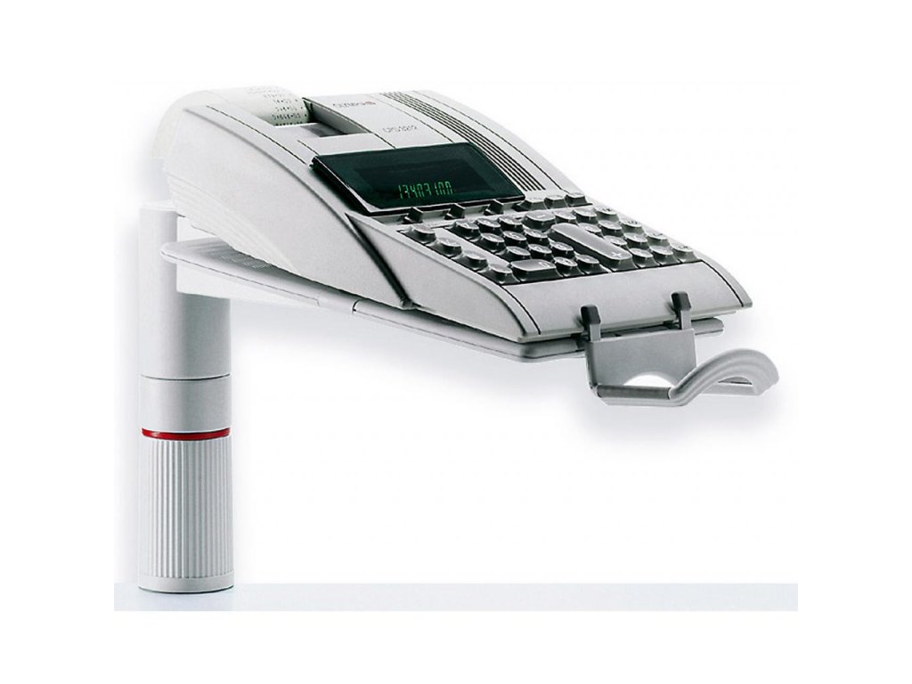 Malý otočný nosič telefónu. Výška nad pracovným stolom 15 cm, nosnosť 6 kg. Dĺžka ramena 21 cm. Dodávaný v štandardnej verzii na hrúbku stola 1,8 až 7,4 cm. Farba sivá.