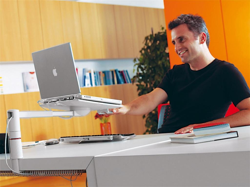 Otočný nosič telefónu s ľahko vysúvateľným ramenom a otáčacou základňou. Výška nad pracovným stolom 10 - 15 cm, nosnosť 2 kg. Dĺžka ramena 22 cm. Dodávaný v štandardnej verzii na hrúbku stola 1,8 až 7,4 cm. Farba sivá.