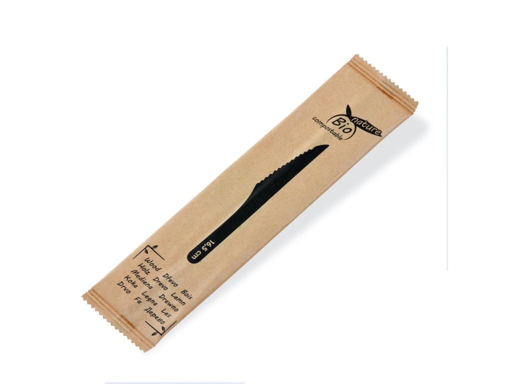 Drevený nôž (DREVO) vhodný pre gastronomické zariadenia, fast foody, bufety, jedálne, na catering, festivaly, grilovačky, oslavy, záhradné party aj v domácnostiach. Materiál DREVO - vzniká v kambiu kmeňa stromov ako tenká vrstva pod kôrou a lykom. Nože sú zhotovené z vybraných osvedčených lesných drevín a prechádzajú osobitnými výrobnými procesmi. Drevo je oveľa šetrnejšie k prírode a životnému prostrediu ako plast. Každý nôž je jednotlivo hygienicky balený v papierovom sáčku. Je veľmi pevný a odolný voči vysokým teplotám.
