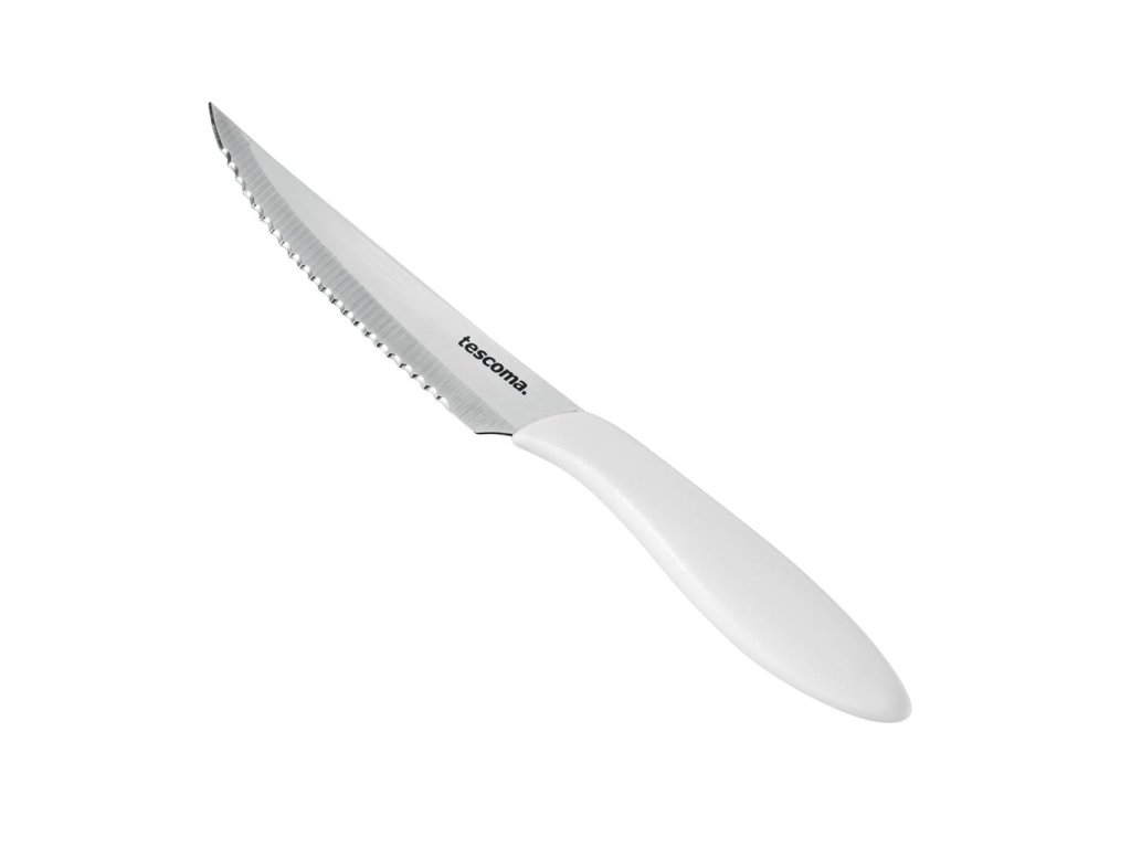 Nože vynikajúce na krájanie prepečených aj krvavých steakov. Sú vynikajúce hlavne na grilovanie a vonkajšie stolovanie. Čepeľ so špeciálne brúsenými zúbkami z prvotriednej nehrdzavejúcej ocele, ergonomická rukoväť z odolného plastu. Po použití umyte a osušte, vhodné do umývačky. 3 roky záruka. Farba biela. Balenie 6 kusov. Dĺžka čepele 12 cm.
