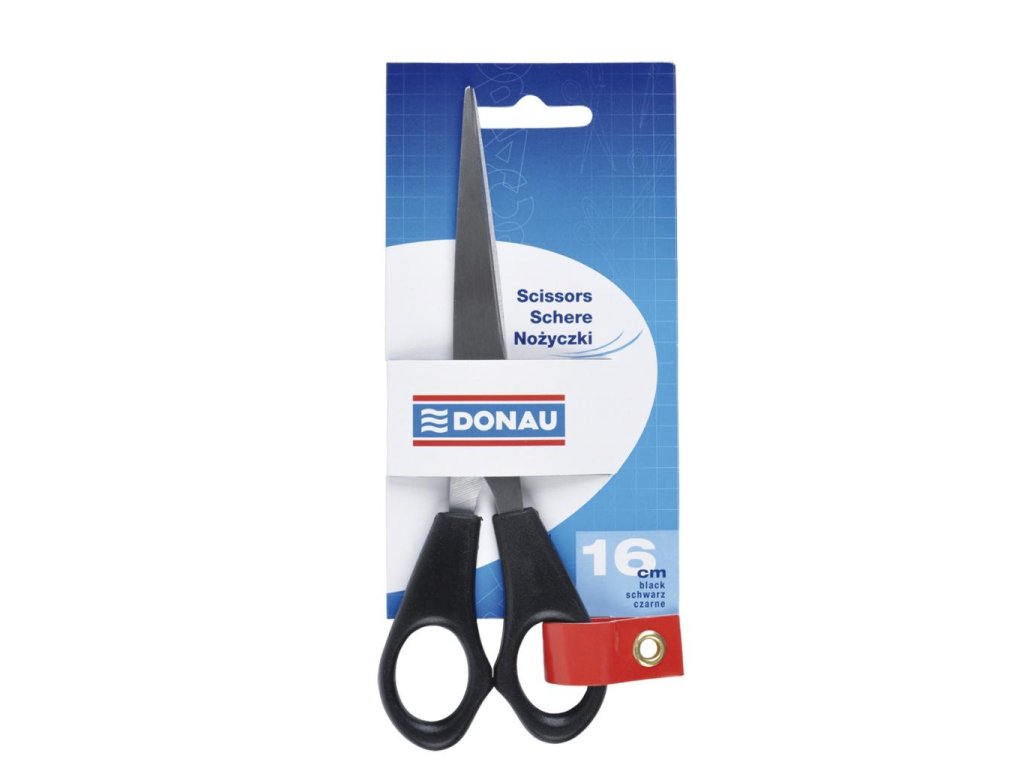 Kancelárske nožnice na strihanie papiera, kartónu, lepenky, samolepiacej pásky a pod. s pogumovaným úchytom a strihacou časťou z nehrdzavejúcej ocele. Farba čierna.