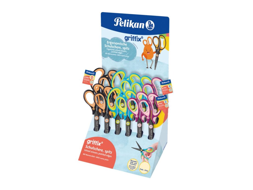Nožnice Pelikan Griffix Displej 12ks mix farieb 4 ks pre ľavákov 8 ks pre pravákov.