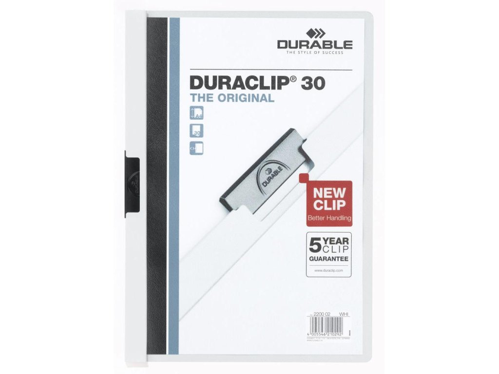 Obal vyvinutý spoločnosťou DURABLE pre viazanie nedierovaných listov. Materiál z PVC s unikátnym kovovým klipom, ktorý sa prispôsobí vloženému počtu listov a priehľadnou prednou stranou. Ideálny na prezentácie, ponuky, správy, poznámky na konferencie, semináre a pod. Formát A4. Kapacita 1-30 listov. Väčšie balenie 25 ks.