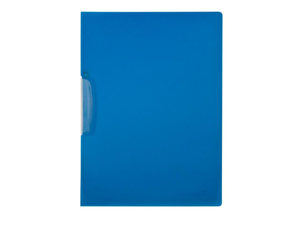 Obal z pevného polypropylénu s priehľadnou prednou stranou vo farbe obalu a priehľadným vyklápacím klipom z plastu. Formát A4. Kapacita 1 - 30 listov. Väčšie balenie 25 ks. Farba modrá.