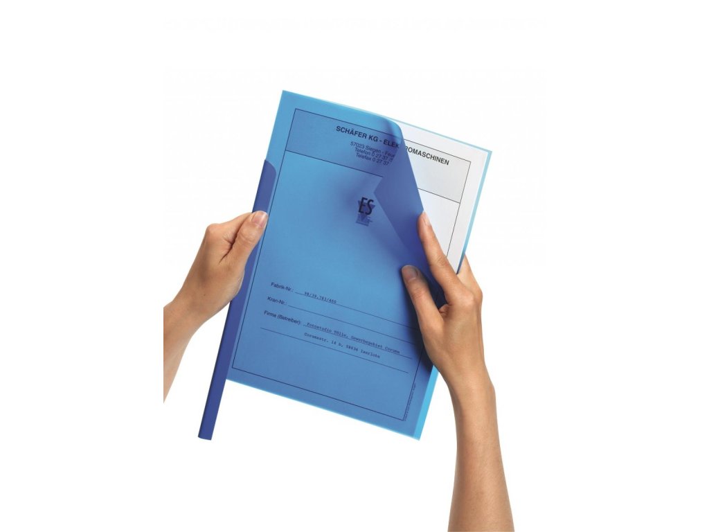 Celopriehľadný obal na použitie s násuvnou lištou. Dodávaný samostatne bez lišty. Formát A4. Kapacita 1-100 listov A4. Materiál PVC. Balenie 50 ks. Farba: priehľadná modrá