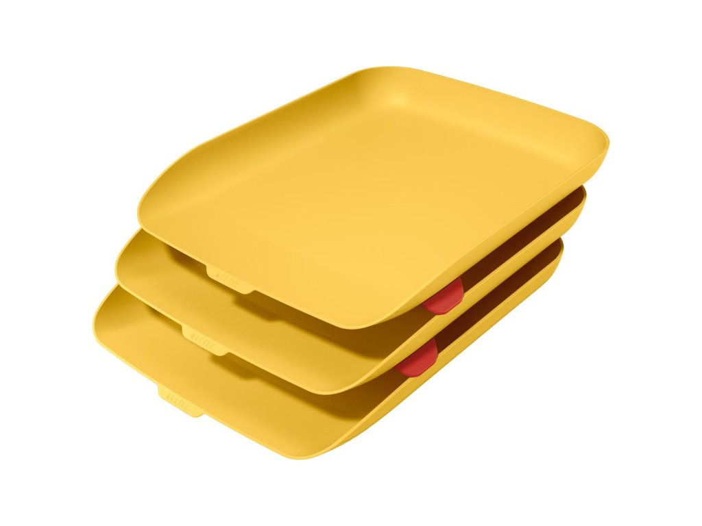 Vhodné na zakladanie papierov, časopisov vo formáte A4 a C4. Odkladače je možné stohovať pomocou dvoch štýlových stohovacích prvkov v červenej farbe, ktoré sú súčasťou balenia. Široký predný otvor umožňuje ľahký prístup k obsahu, aj keď je naskladaný. Balenie bez plastov. Rad Leitz Cosy kombinuje domáce pohodlie a štýl s prvotriednou kvalitou a vytvára pozitívne a produktívne pracovné prostredie. Rozmery 1 odkladača (Š x V x H): 274 x 120 x 456 mm. Farba žltá.