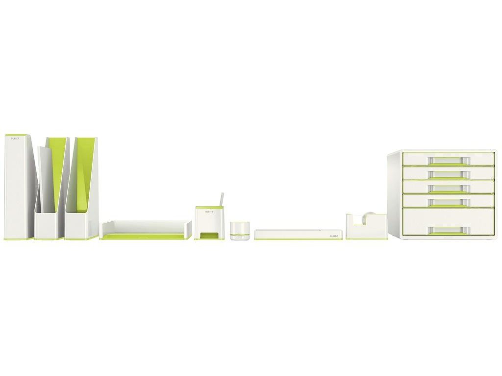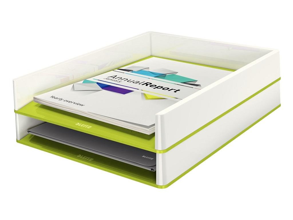 Stohovateľný kancelársky odkladač na dokumenty, časopisy a zložky v dvojfarebnom prevedení v metalických farbách WOW s lesklým povrchom. Farba zelená.