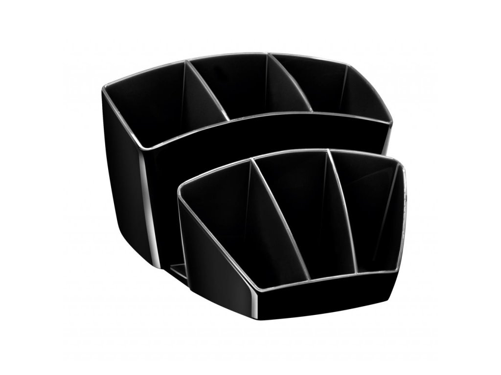 Dômyselne navrhnutý kompaktný a elegantný stolný organizér na kancelárske príslušenstvo. Kapacita: 40 pier, 5 zvýrazňovačov a 3 všeobecné priehradky. Na spodnej časti protišmyková podložka. Celkové rozmery 143 × 158 × 93 mm. 100% recyklovateľný, vysokokvalitný plast. Väčšie balenie 6 ks. Farba čierna.