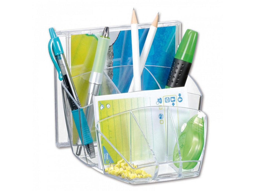 Dômyselne navrhnutý kompaktný a elegantný stolný organizér na kancelárske príslušenstvo. Kapacita: 40 pier, 5 zvýrazňovačov a 3 všeobecné priehradky. Na spodnej časti protišmyková podložka. Celkové rozmery 143 × 158 × 93 mm. 100% recyklovateľný, vysokokvalitný plast. Väčšie balenie 6 ks. Farba transparentná číra.
