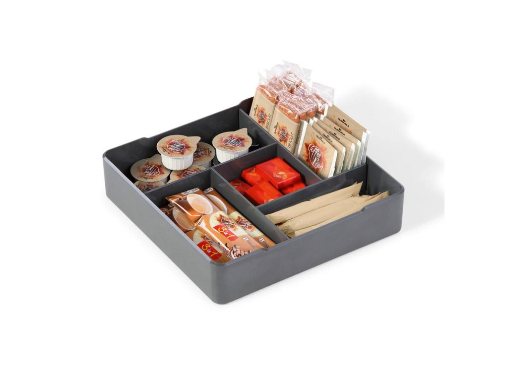 Praktický pomocník pri servírovaní občerstvenia. Dizajn zameraný na aplikáciu oddelených priestorov, kde si nájde svoje miesto porciovaný cukor, miešadlá, lyžice, špáradlá, smotany do kávy, obrúsky, drobné pochutiny ku káve a čaju, čajové vrecká. Materiál vysokokvalitný plast, možnosť umývania v umývačke. Rozmery (š × h × v) 210 × 210 × 48 mm. Farba čierna.