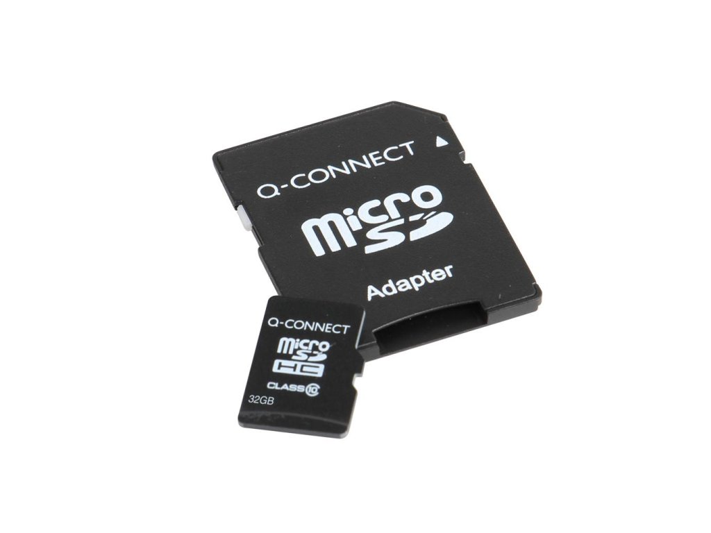 Pamäťová karta s SD adaptérom, class 6, rozmery 11 × 15 × 1 mm. Kapacita 32 GB.