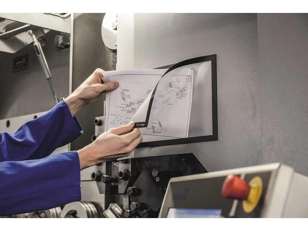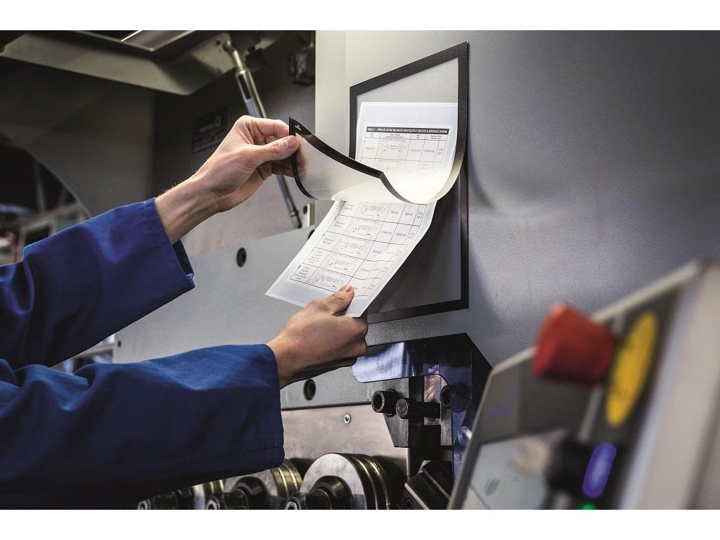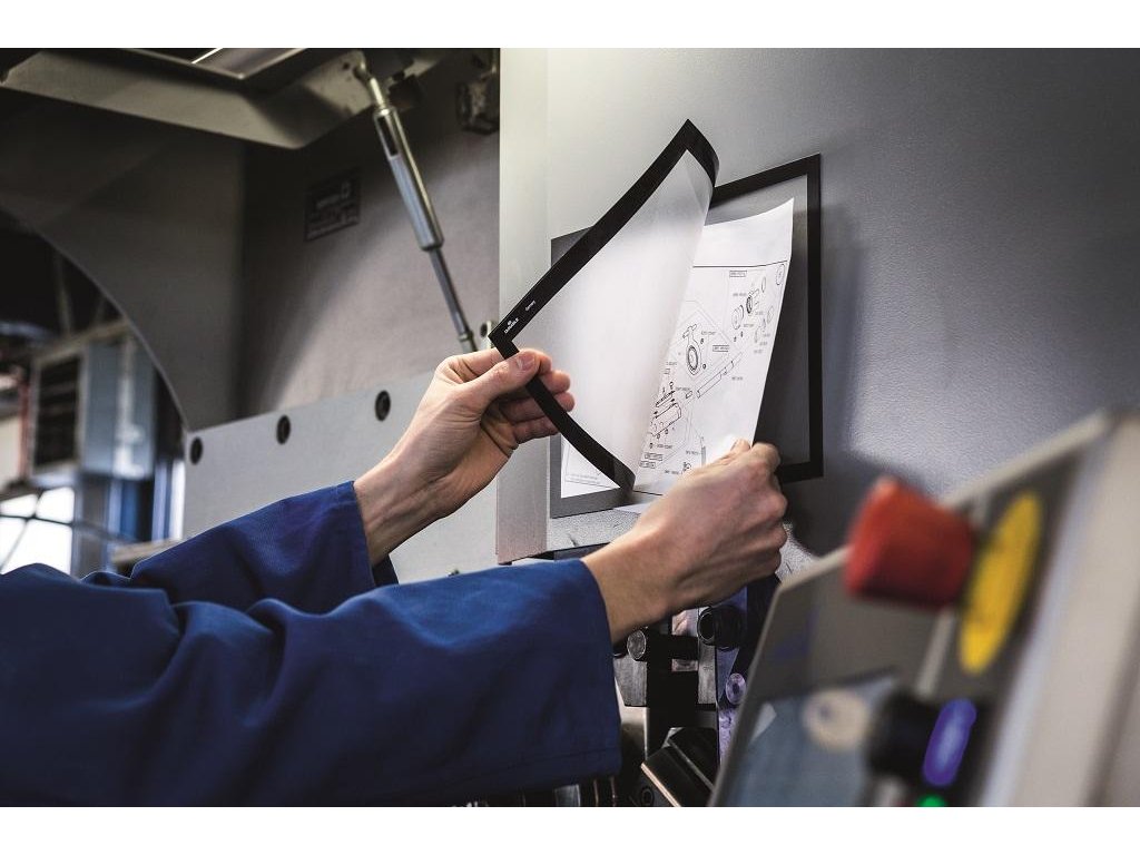 Panel s plne magnetickou zadnou časťou na posilnené držanie na kovových povrchoch. Jednoduché a rýchle vkladanie informácie formátu A4.
