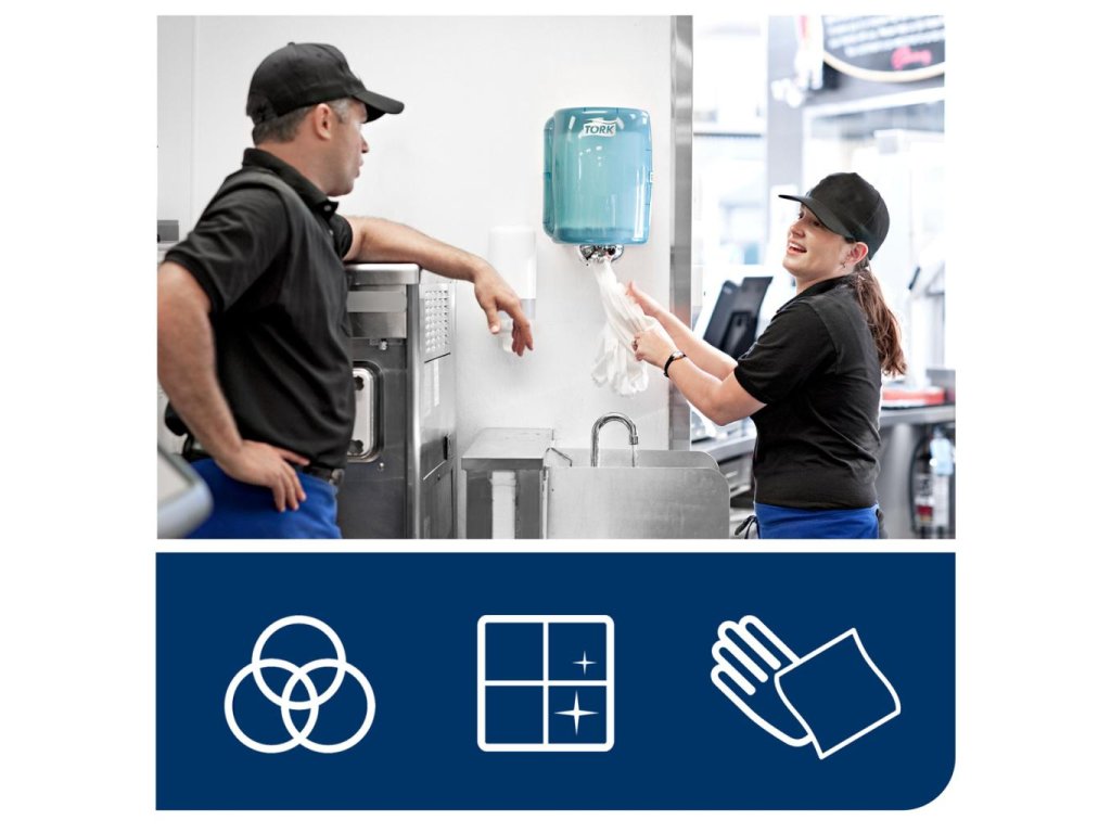 Tork jednovrstvová viacúčelová papierová utierka je ideálna na ľahké úlohy čistenia a na utieranie rúk. Táto papierová utierka sa môže používať v Tork® zásobníku na kotúče so stredovým odvíjaním, ktorý je vysokokapacitným, viacúčelovým riešením pre profesionálne prostredia, kde sú na utieranie povrchu potrebné obe ruky.