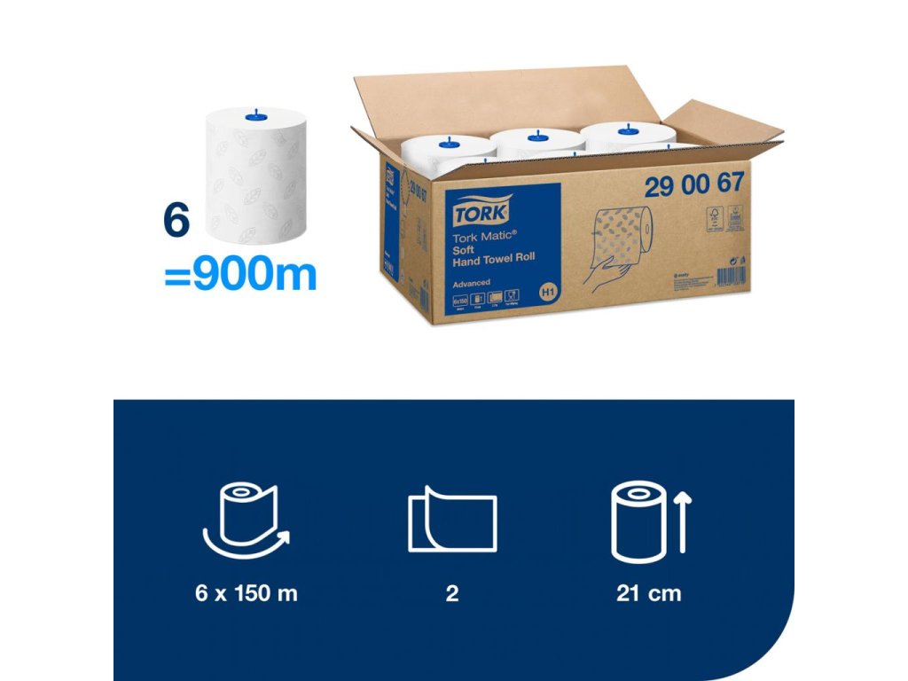 Biele jemné dvojvrstvové utierky v kotúči, v kvalite Advanced zaistia dobré usušenie rúk a majú veľmi peknú sivú ozdobnú razbu v tvare listu. Kotúče možno použiť do zásobníka na papierové utierky na ruky Tork Matic®, ktoré boli vyvinuté na jednoduchú údržbu na frekventovaných toaletách a umyvárňach. V predaji po balení (6 roliek).