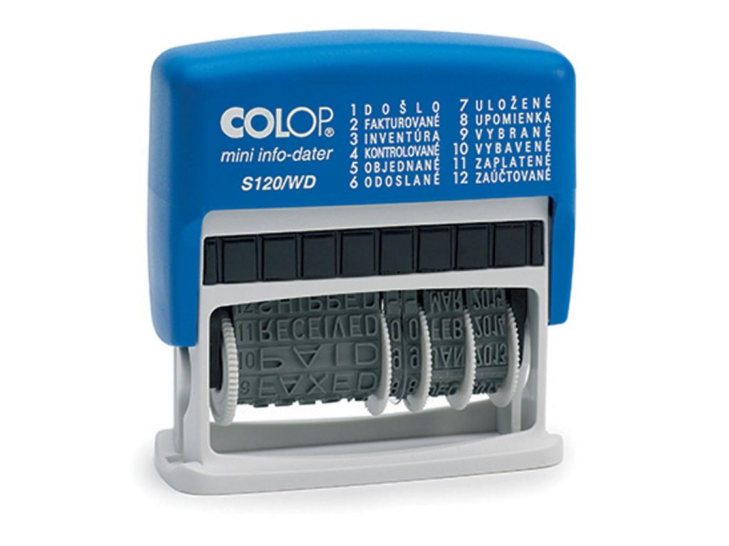 Integrovaná 2-farebná pečiatková poduška modrá/ červená, kde je text modrý a dátum červený. Možnosť výberu z 12 textov: DOŠLO, FAKTUROVANÉ, INVENTÚRA, KONTROLOVANÉ, OBJEDNANÉ, ODOSLANÉ, ULOŽENÉ, UPOMIENKA, VYBRANÉ, VYBAVENÉ, ZAPLATENÉ, ZAÚČTOVANÉ. Náhradná poduška E/12 modrá/ červená.