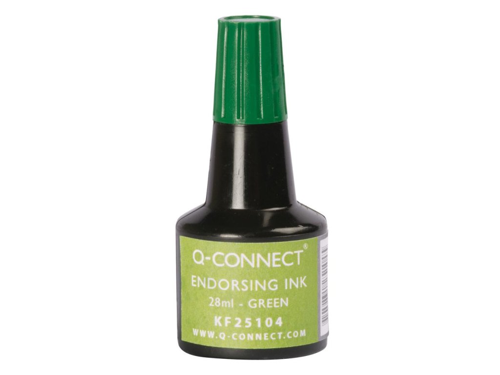 Q-Connect univerzálna pečiatková farba bezolejová, vhodná na gumené a samofarbiace pečiatky. Objem 28 mℓ. Väčšie balenie 10 ks. Farba zelená.