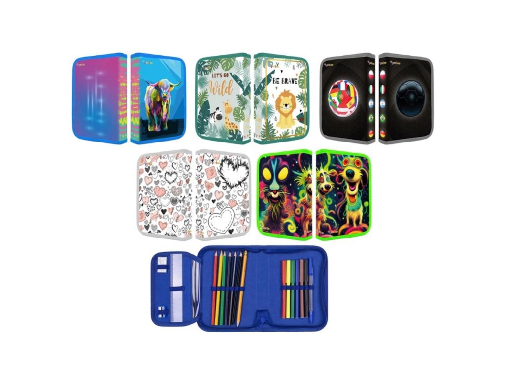Kvalitné 2-klopé peračníky s príslušenstvom, 32 dielov. Dodávané v mixe motívov. Rozmery 19,5 x 13,5 x 3,2 cm. Balenie 10 ks. Farba mix.
