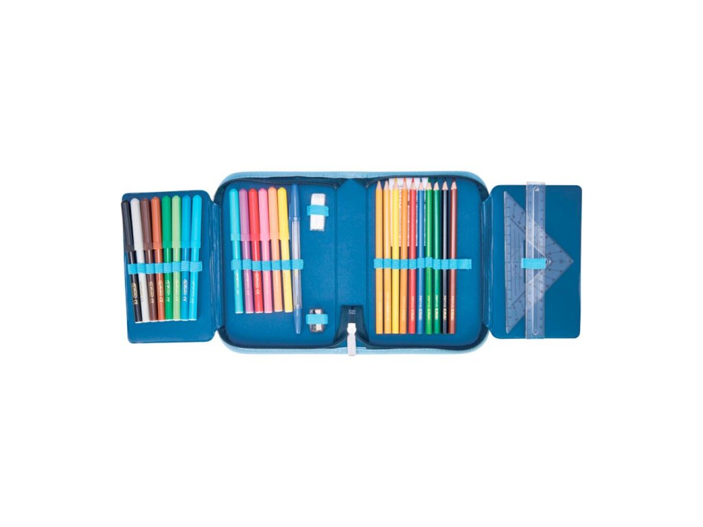 Peračník 2-klopý s výbavou, vnútorná podšívka: farebná. Výbava: 14 fixiek, 8 šesťhranných pasteliek, 2 ceruzky šesťhranné, 1 plastové strúhadlo, 1 guma, 1 plastové pravítko 16 cm, 1 trojuholníkové pravítko, 1 guľôčkové pero, 1 rozvrh hodín, 1 vizitka. Dizajn: Kozmonaut.