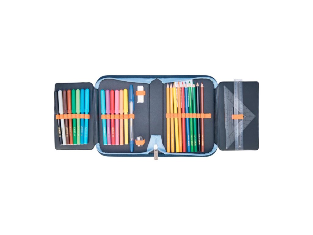 Peračník 2-klopý s výbavou, vnútorná podšívka: farebná. Výbava: 14 fixiek, 8 šesťhranných pasteliek, 2 ceruzky šesťhranné, 1 plastové strúhadlo, 1 guma, 1 plastové pravítko 16 cm, 1 trojuholníkové pravítko, 1 guľôčkové pero, 1 rozvrh hodín, 1 vizitka. Dizajn: TechMech.