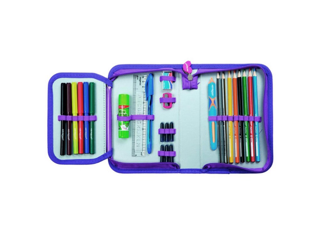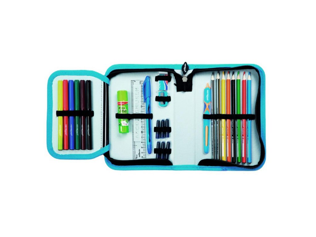 Školský peračník 1-zipsový s výbavou, 29 položiek. V súprave: 6 fixiek, lepidlo, strúhadlo, guma, modré guľôčkové pero, 6 modrých atramentových náplní, 2 HB ceruzky, plniace pero, 6 pasteliek, pravítko 15 cm, 2 plastové šablóny s písmenami (AM, NZ). Materiál PVC, zips, má jednu priehradku a dve priečky. Rozmery: 19 x 13 x 4,2 cm. Farba: mix farieb, mix vzorov.