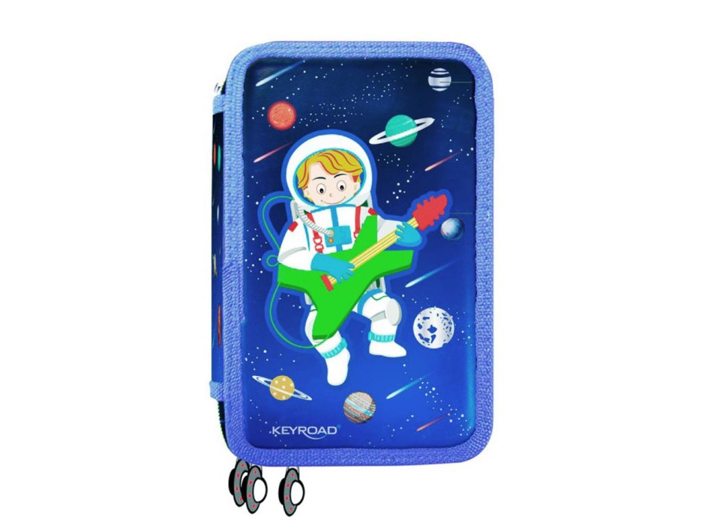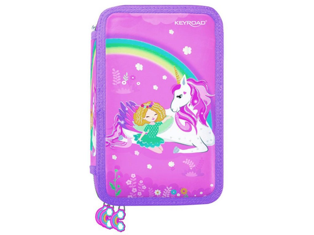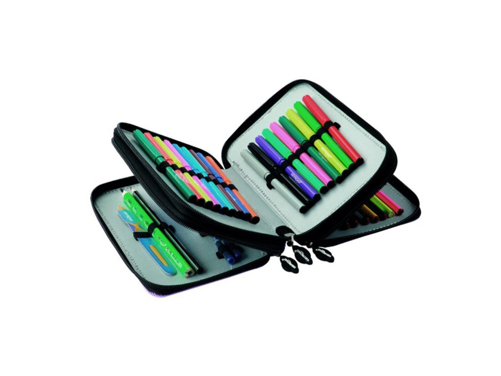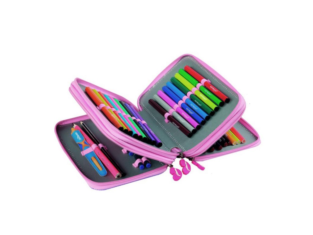 Školský peračník s výbavou, 52 prvkov. V súprave: fixky 18 ks, ceruzkové pastelky (vrátane 3 metalických), jumbo ceruzka HB, ceruzka HB, guma, strúhadlo, plniace pero, 4 ks. Modré atramentové kazety, 2 ks. Plastové šablóny s písmenami (AM, NZ), pravítko 15 cm, uhlomer, nožnice 13 cm, držiak na ceruzku. Materiál PVC, zips, má tri komory. Rozmery: 20,5 x 13,5 x 6 cm. Farba: mix farieb, mix vzorov.