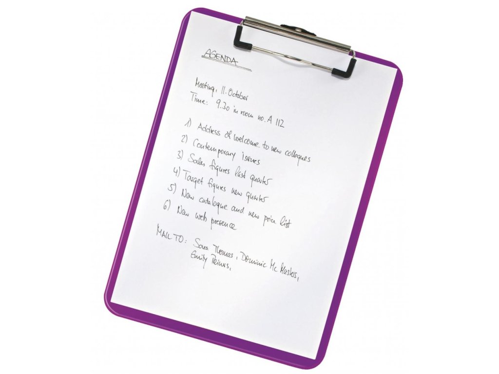 Pevná písacia podložka A4 na každodenné použitie v sviežich farbách WOW s dvojfarebným efektom. Silná kovová spona na uchytenie až 80 listov, háčik na zavesenie. Materiál polystyrol. Väčšie balenie 10 ks. Farba purpurová.