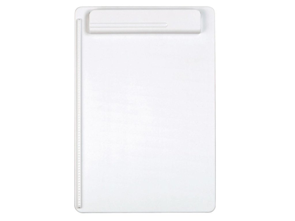 Podložka na písanie z recyklovaného plastu, vyrobená udržateľným a sociálne zodpovedným spôsobom. Zarážka papiera vľavo, integrovaný držiak na písacie potreby. Široká svorka so silnými kovovými pružinami. Šírka spony cca 0,8 cm, hrúbka 0,3 cm. Rozmer 34,3 x 23,3 x 1,6 cm. Farba biela.