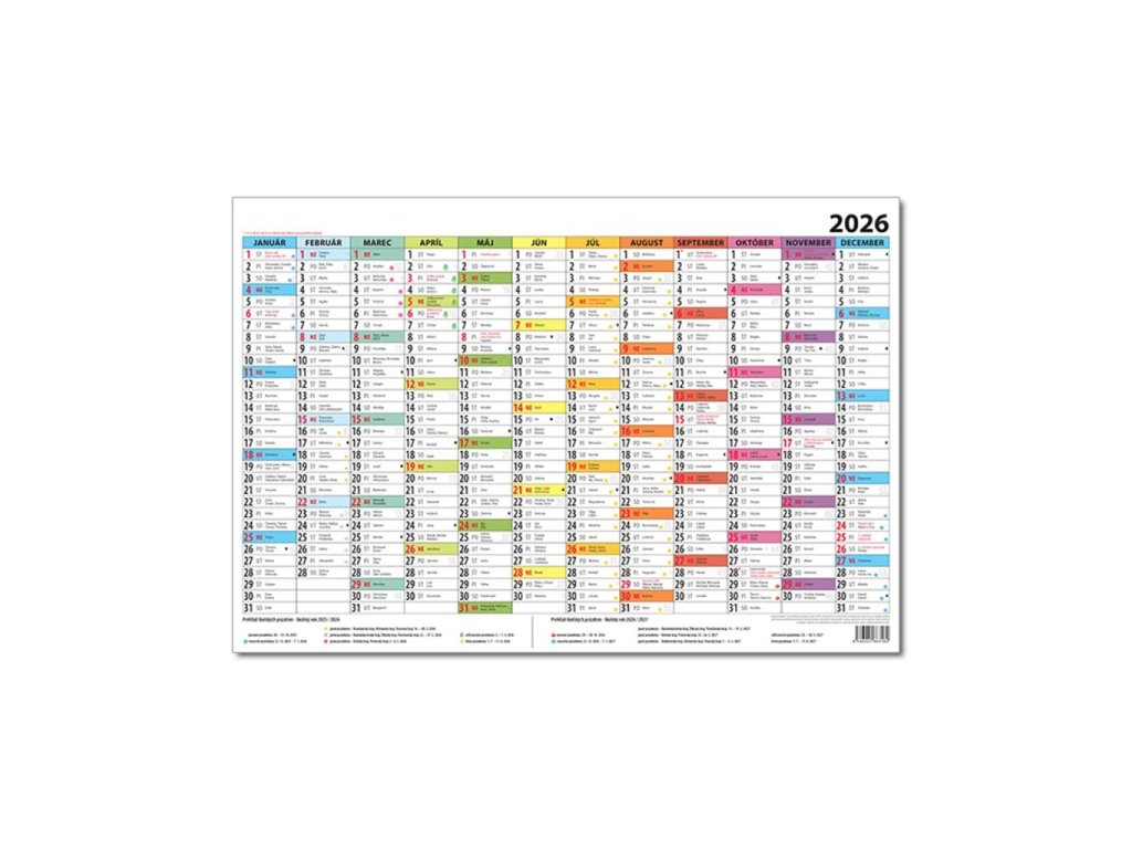 Jednolistový plánovací kalendár farebný obsahujúci menné kalendárium a termíny školských prázdnin na Slovensku.